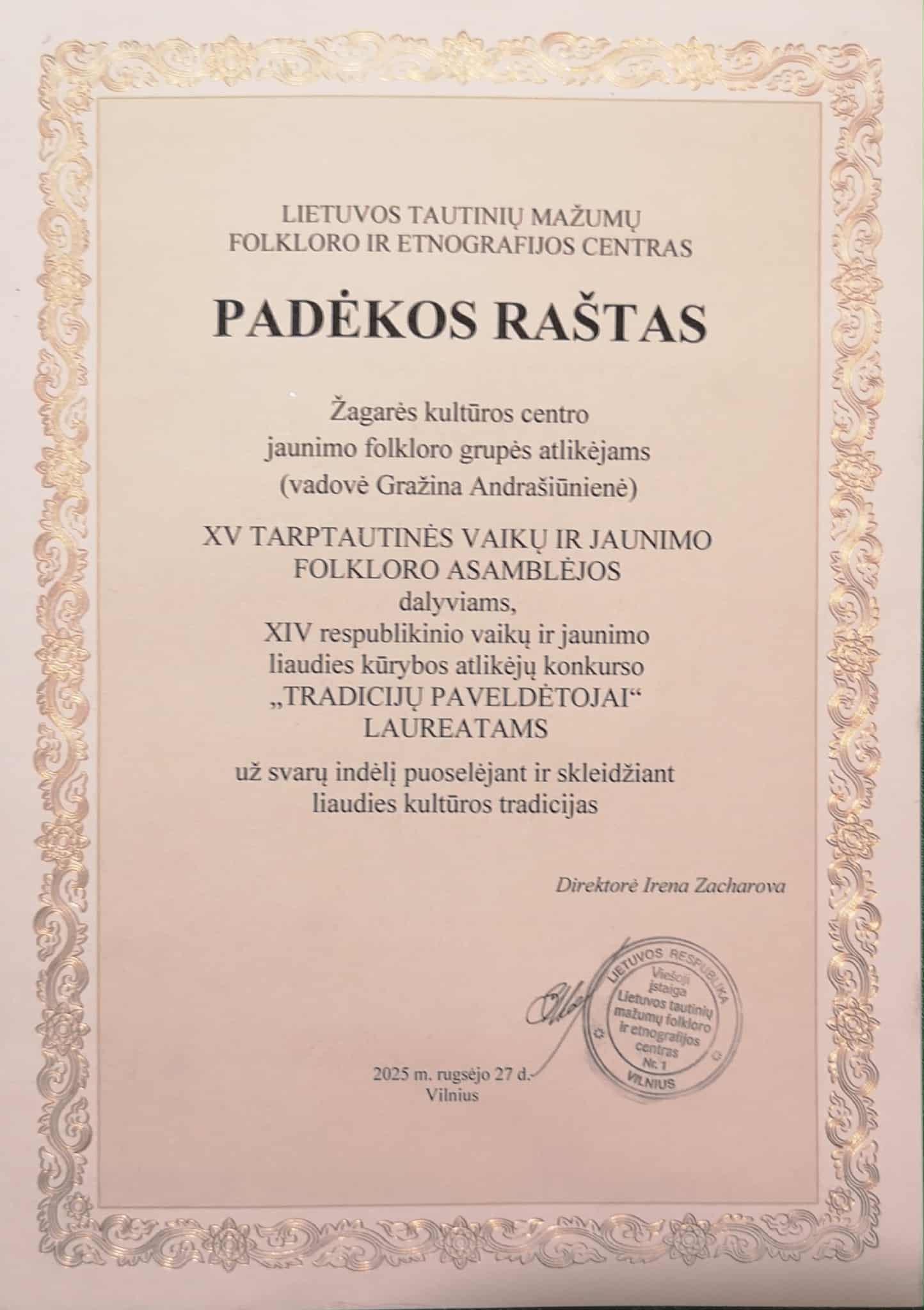 Šioje ypatingoje dienoje šurmuliavo kūrybinės tradicinių amatų dirbtuvės „Liaudies meistrai – vaikams“ bei spalvomis džiugino piešinių paroda „Čiurlionis vaikų akimis“. Be abejo, skambėjo ir „Tradicijų paveldėtojų“ – respublikinio liaudies kūrybos atlikėjų konkurso laureatų koncertas. Didelė garbė, kad tarp laureatų pasirodė ir Žagarės jaunimo folkloro grupė (vadovė Gražina Andrašiūnienė).